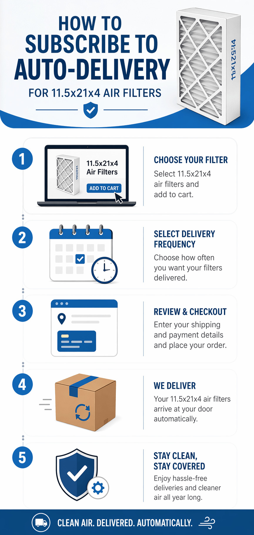 Auto-delivery, sometimes called a filter subscription, ships a fresh 11.5x21x4 to your door every 30, 60, or 90 days. You set the cadence once. The new filter arrives on schedule, so the one in your vent never gets a chance to go gray.